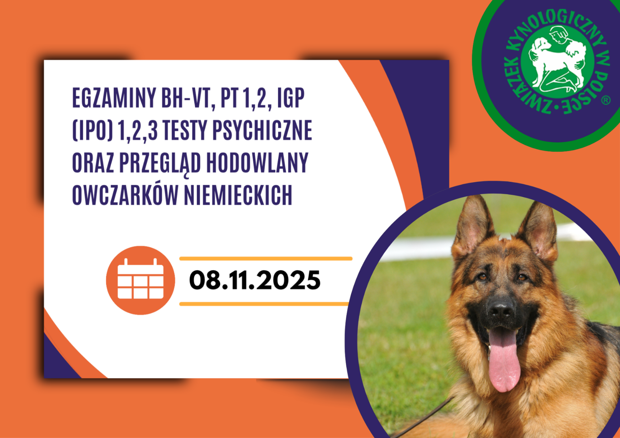 Serdecznie zapraszamy na egzaminy – BH-VT, PT 1,2, IGP (IPO) 1,2,3 Testy psychiczne oraz przegląd hodowlany owczarków niemieckich – w dniu 08.11.2025 r., które odbędą się w Lubiczu Górnym 87-162 przy ul. Rzemieślniczej 8. Godziny rozpoczęcia poszczególnych egzaminów i testów prosimy konsultować z kierownikiem sekcji szkolenia Rafałem Brzostowskim (723103842).